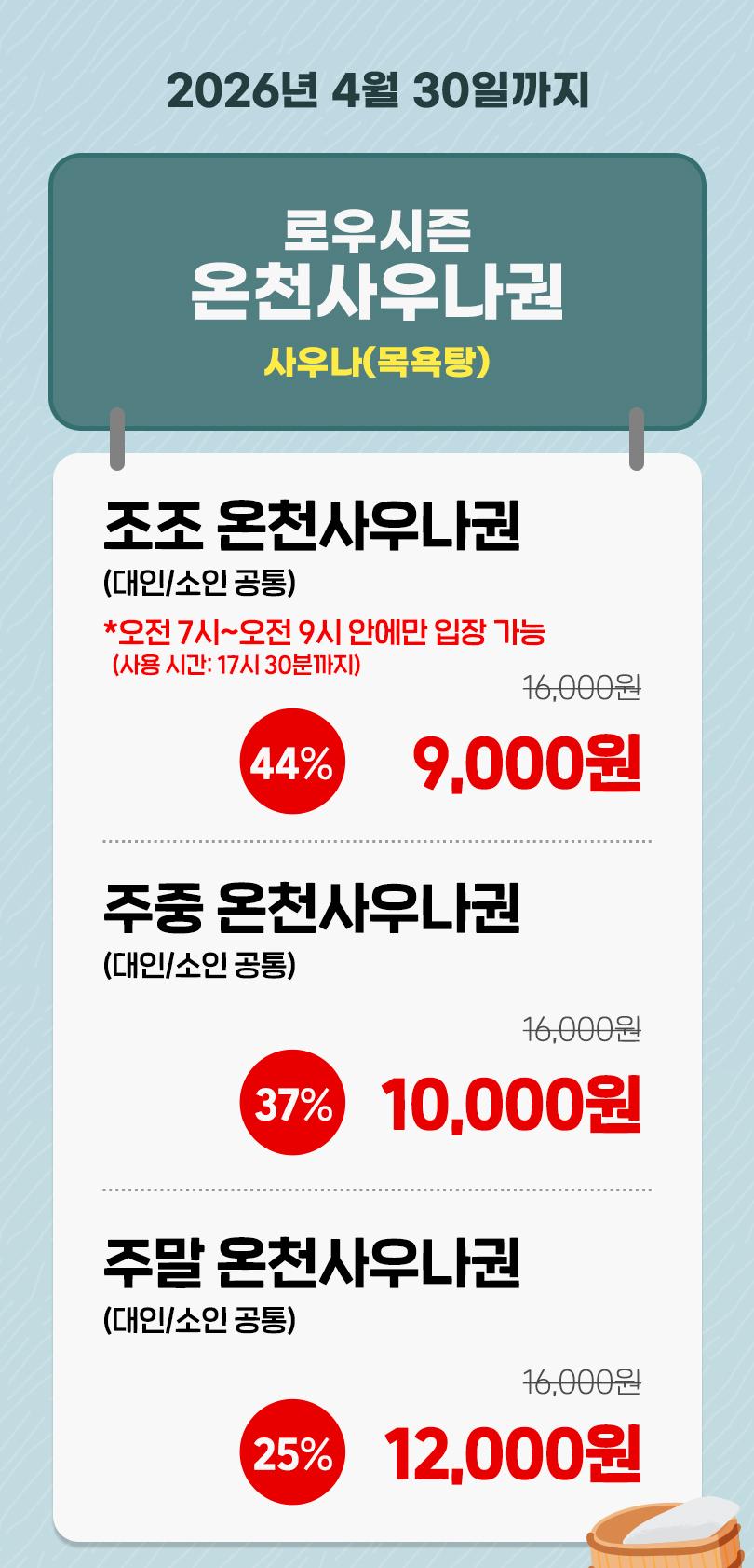 * 온천사우나 권종 티켓은 오전7시에서 오전 9시에만 입장 가능한 티켓입니다 (사용 가능 시간 : 17시 30분까지)