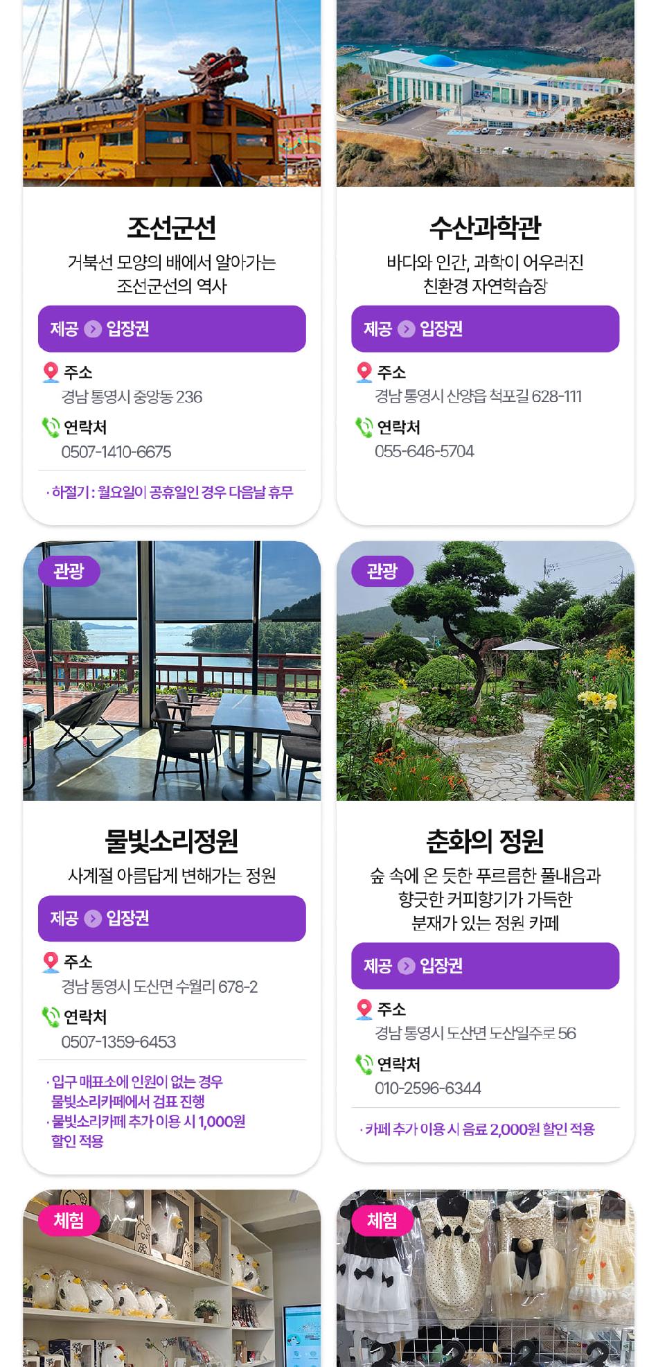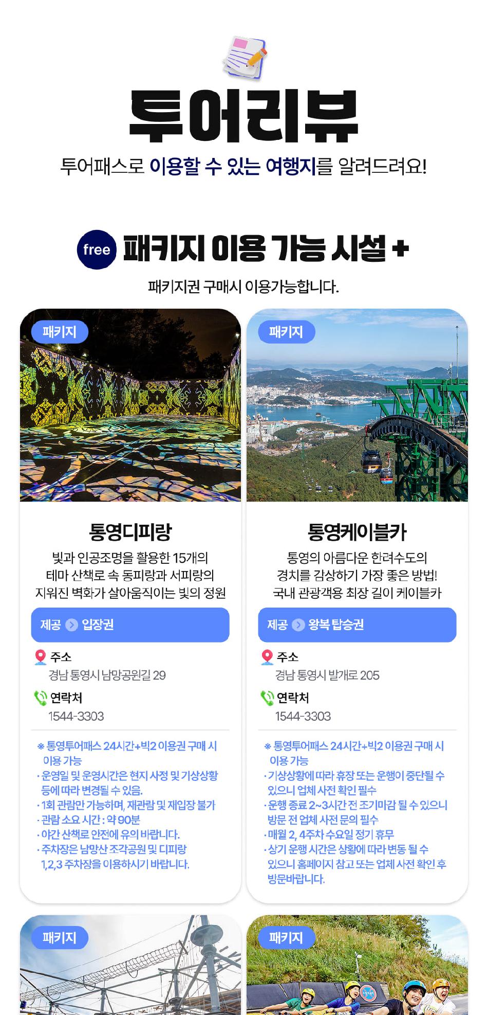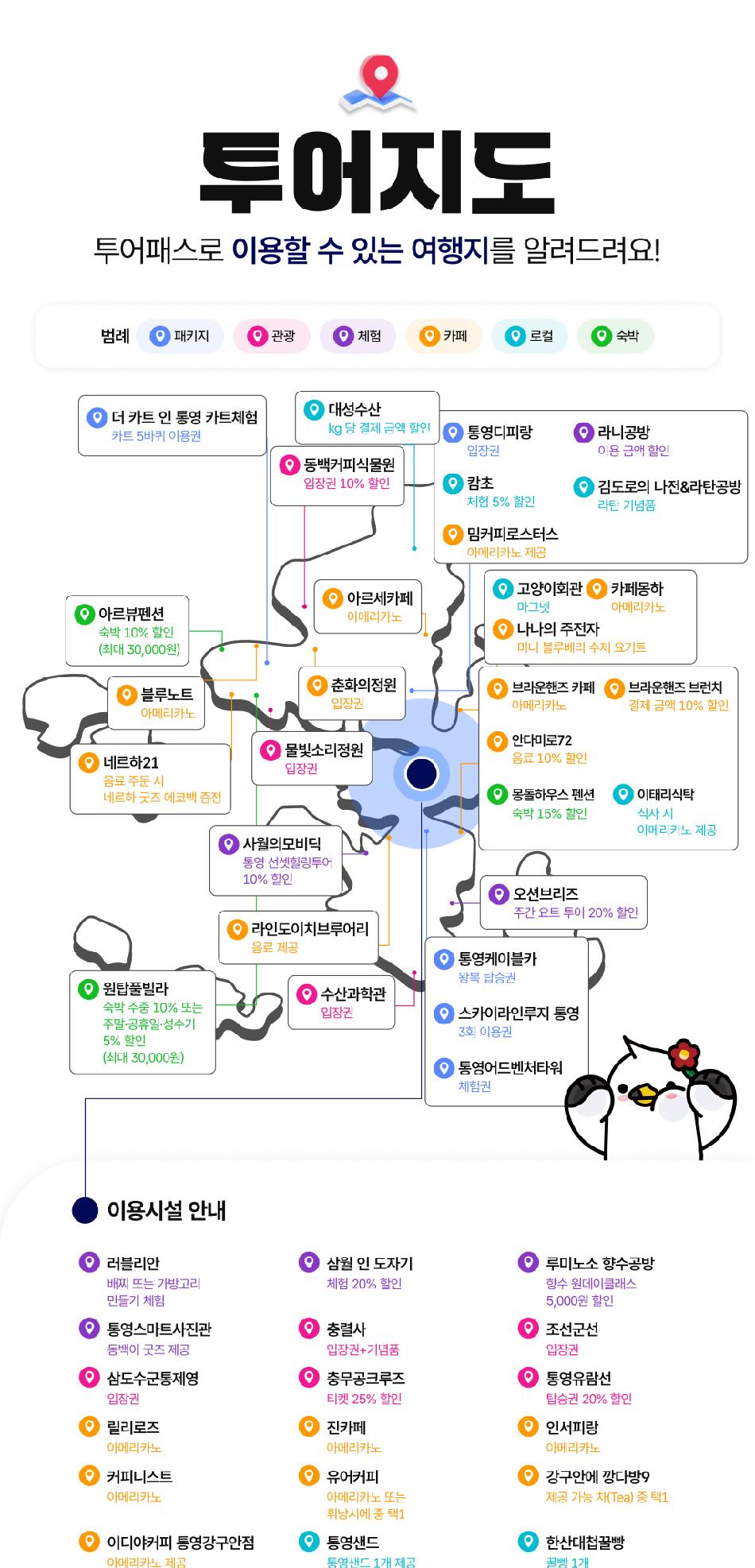 * 이용 가능한 업체 리스트는 구매 후에도 실시간으로 변경 될 수 있으니 모바일 티켓의 ‘투어패스 이용가능 여행지’를 확인 하시어 이용 바랍니다.