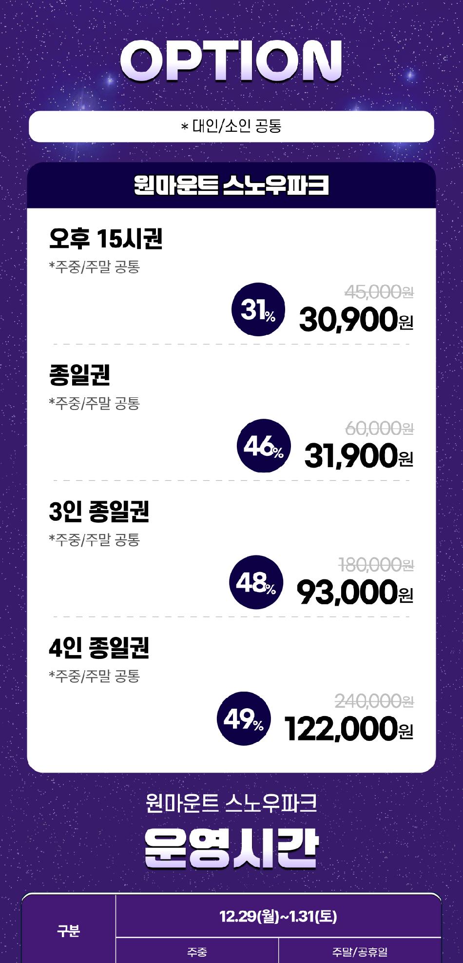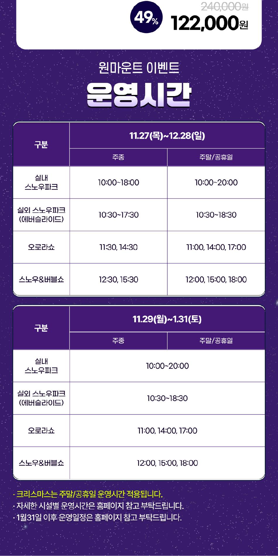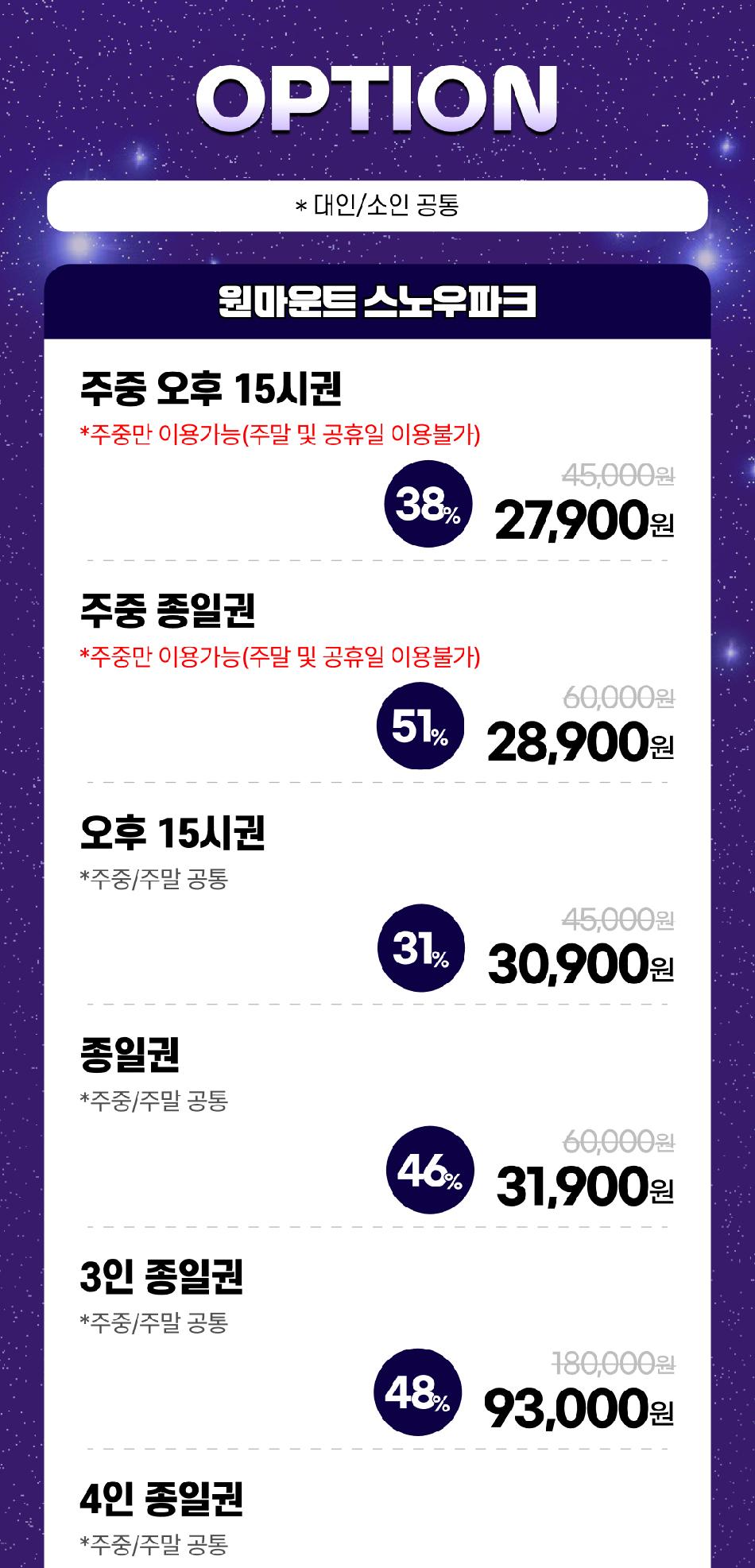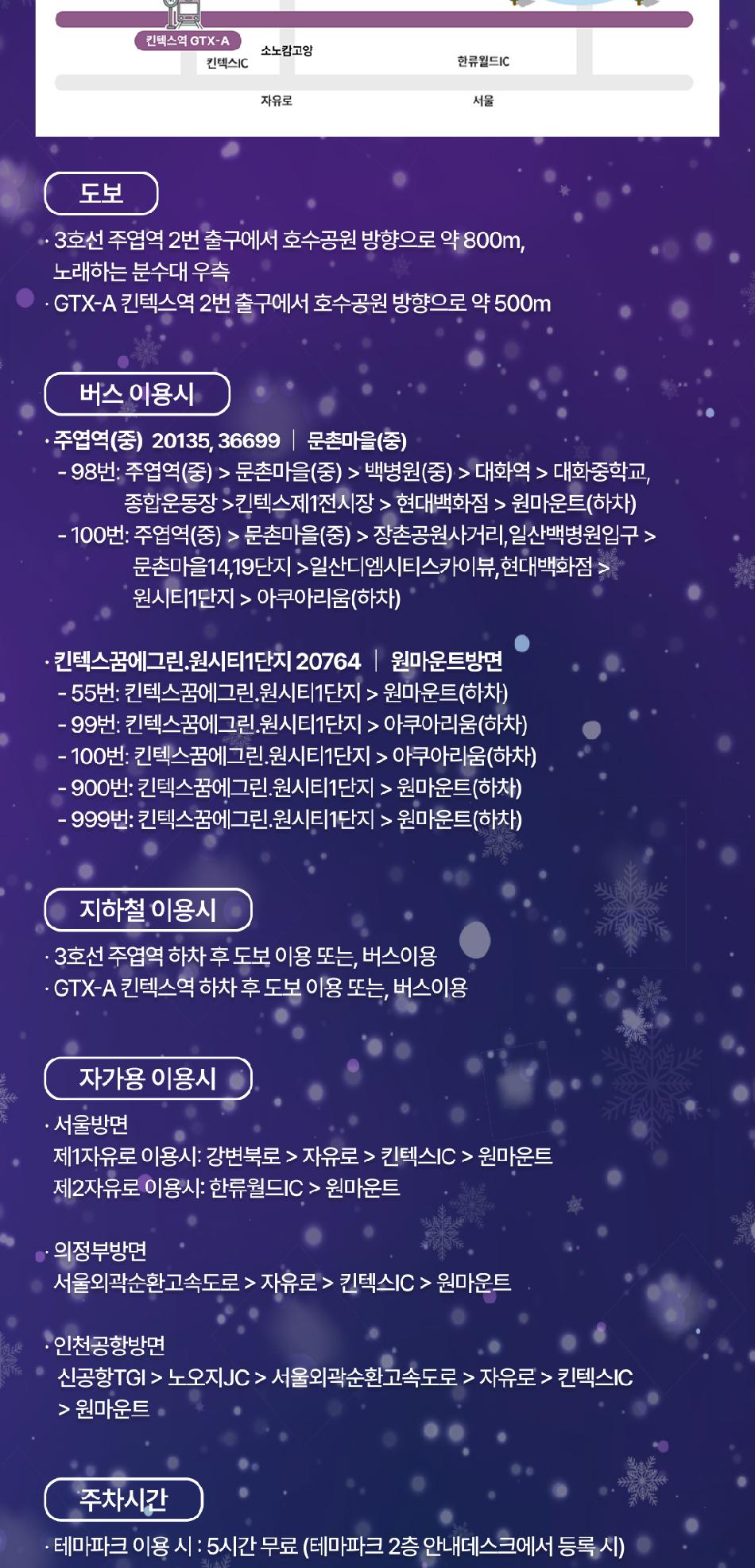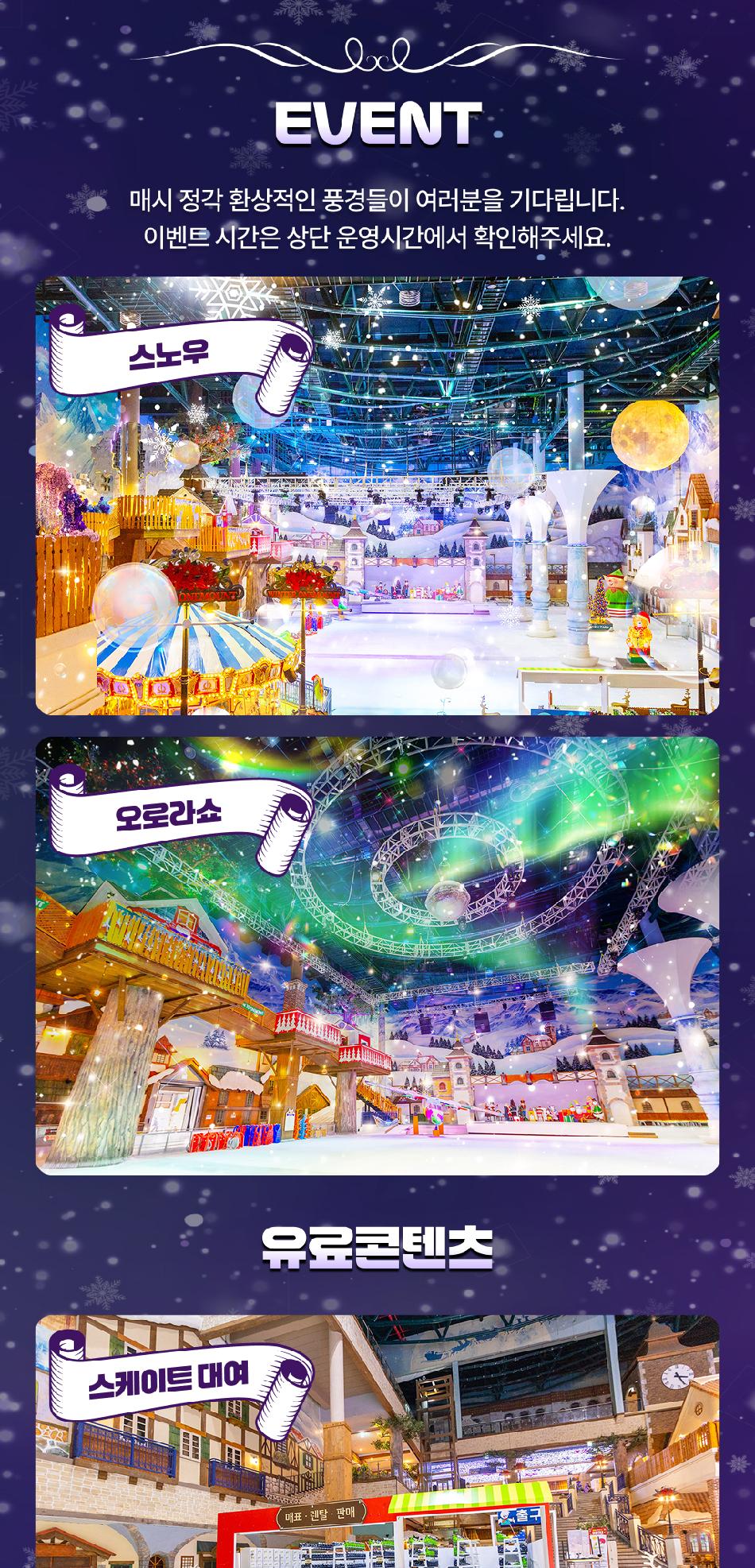 - 스노우파크 이용시 5시간 무료 (테마파크 2층 안내데스크에서 등록 시)