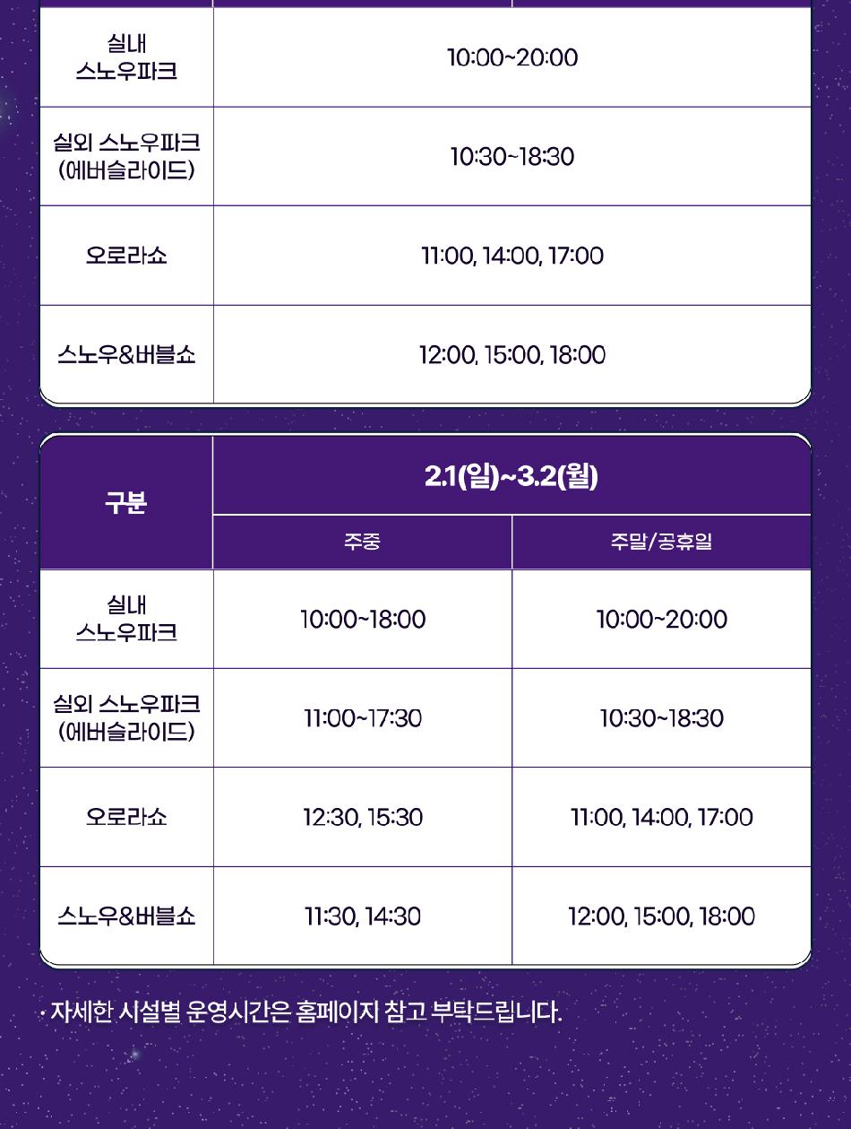 * ※ 자세한 운영시간은 컨텐츠 및 홈페이지 참고 부탁드립니다.