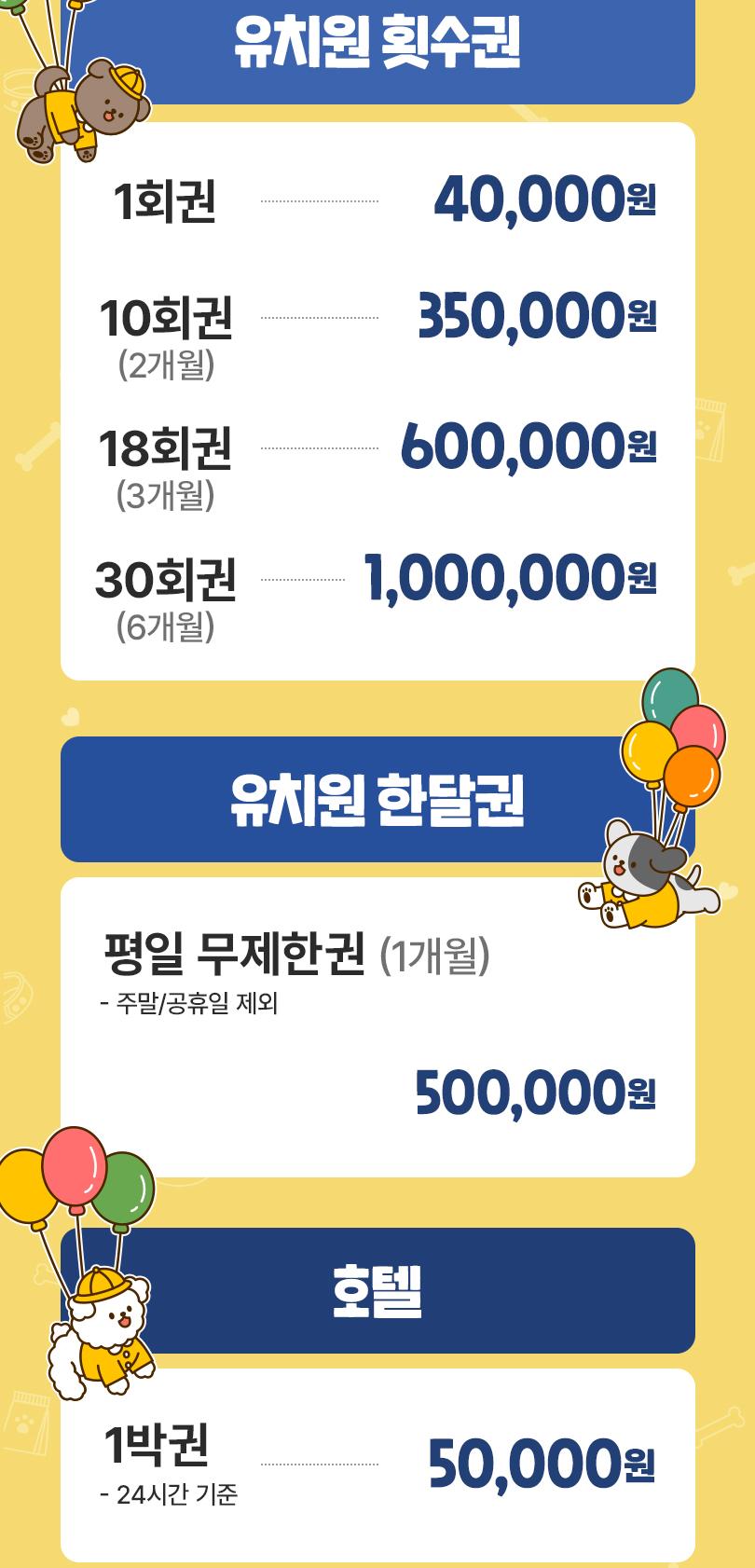 - 활동량이 많은 공간으로 노견 및 건강 이슈가 있는 친구는 입학테스트 후 입학제한이 될 수 있습니다.