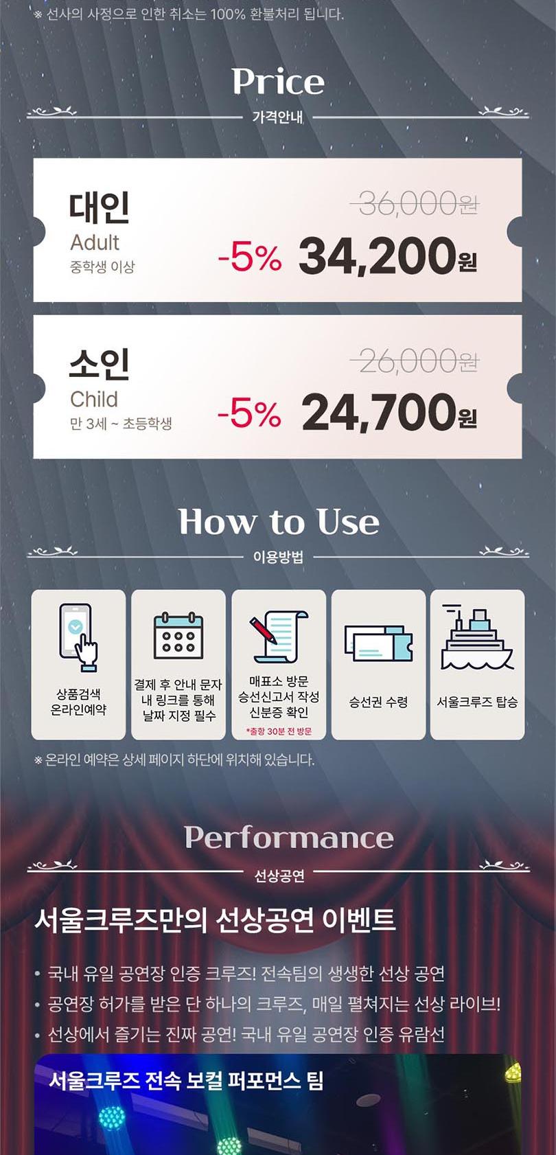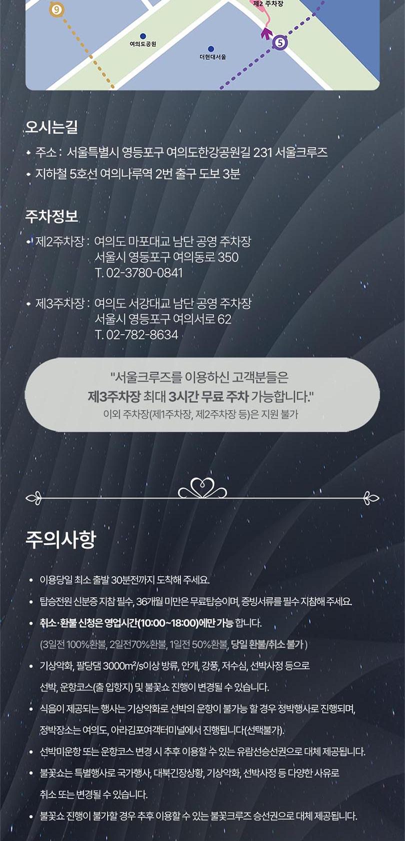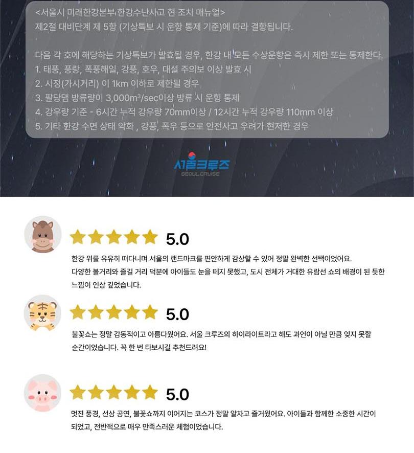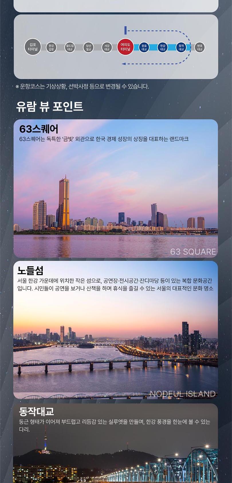 *한강방류, 기상악화, 선박사정 등으로 한강 운항이 불가능할 경우 아라뱃길 코스로 진행되며, 이로 인한 환불 및 요금 인하는 없습니다.