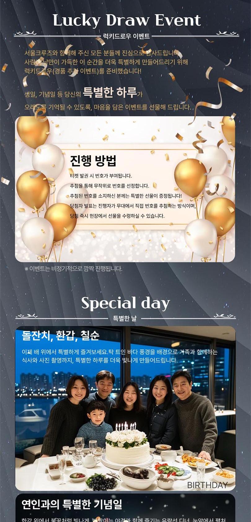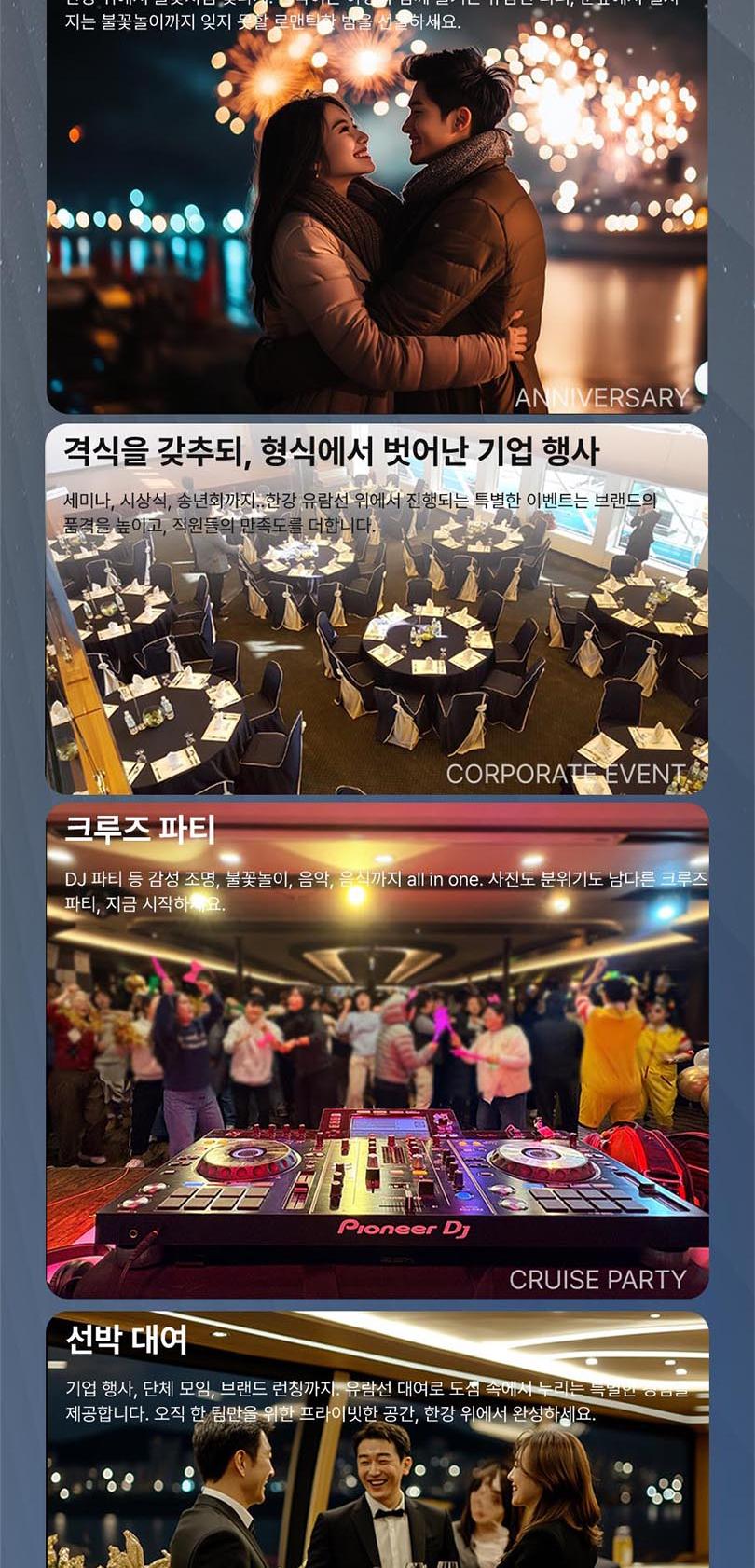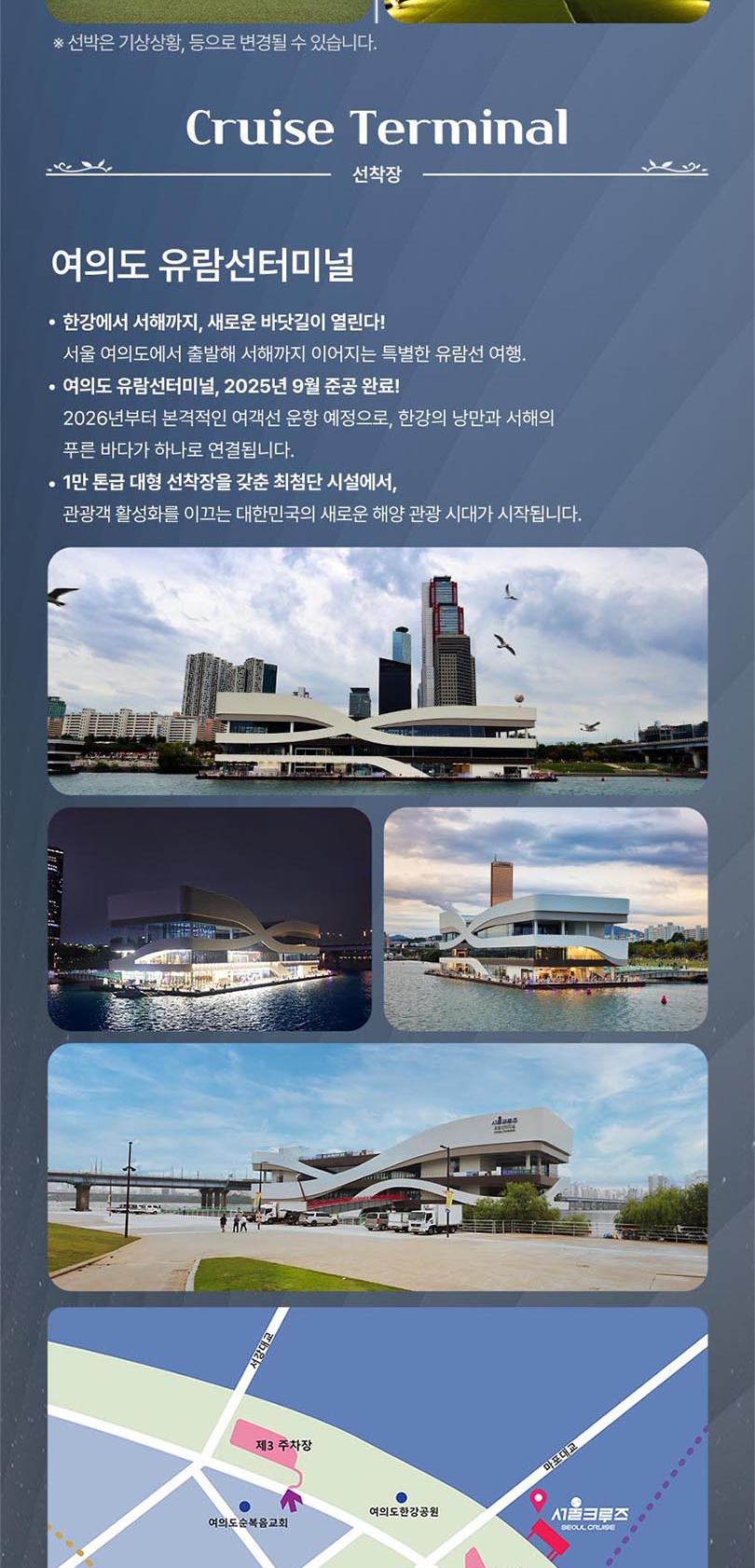 *한강방류, 기상악화, 선박사정 등으로 한강 운항이 불가능할 경우 아라뱃길 코스로 진행되며, 이로 인한 환불 및 요금 인하는 없습니다.