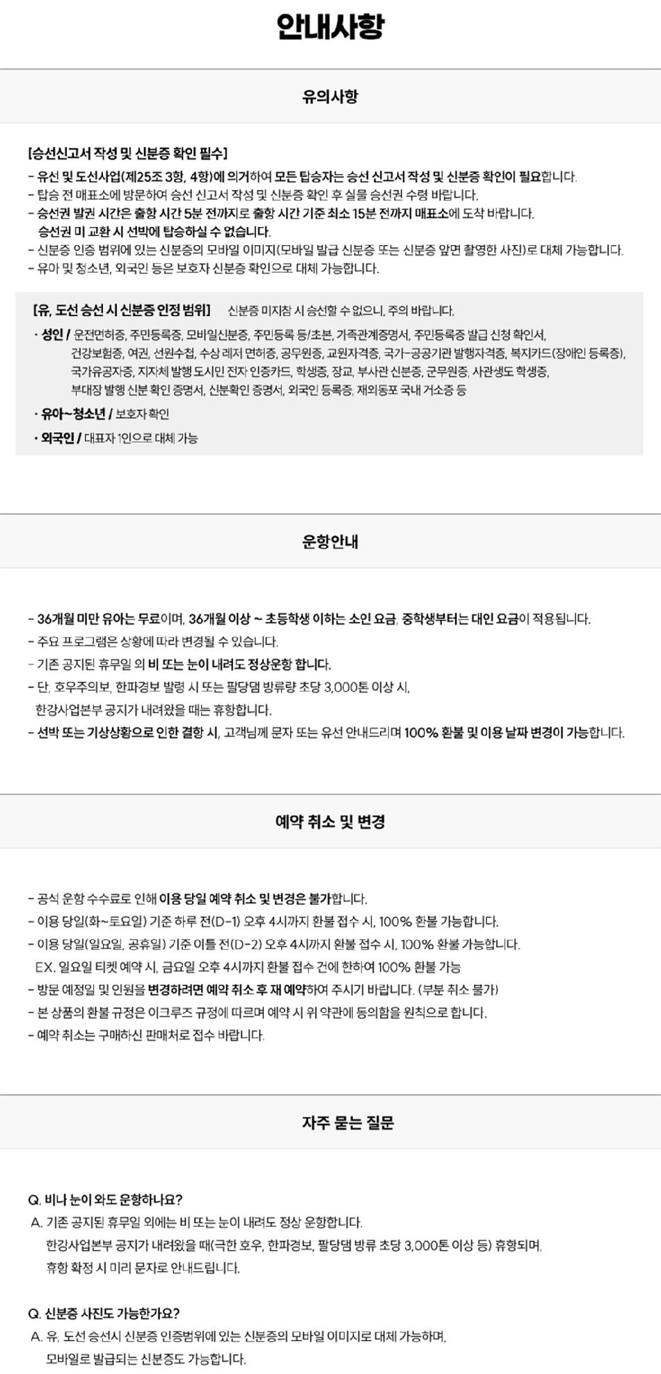 * ※ 유선 및 도선 사업 법에 의해 승선하시는 모든 분들(성인만) 신분증 지참 필수입니다. (현장확인)