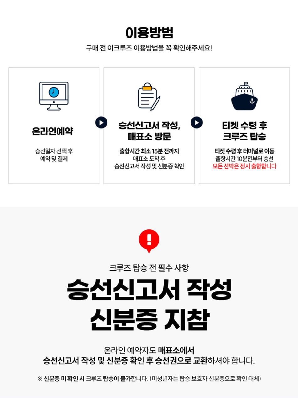 * 매표소 미 방문 및 티켓 미 수령 시 크루즈 탑승이 불가하며, 발권을 위해 최소 30분 전 매표소 방문 바랍니다.