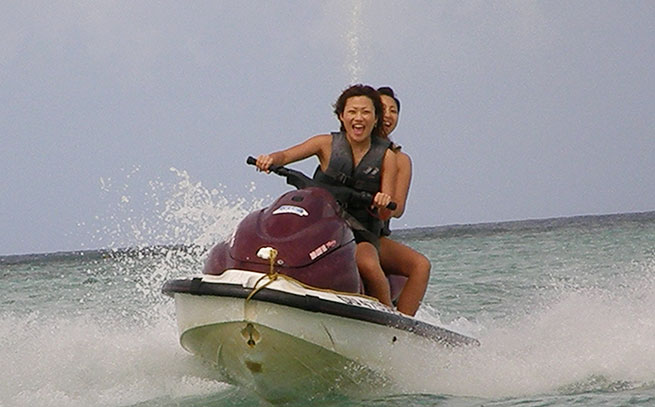 제트 스키: 제트 스키는 물에서 즐길 수 있는 가장 아찔한 수상 스포츠다. 초보자들은 괌 파도 위에서 제트 스키를 타는 법을 한번쯤은 배워보자. 숙련자들은 수상스키 장비를 빌리기만 하면 된다. 제트스키는 취향에 따라 혼자 타거나 친구와 탈 수 있다.