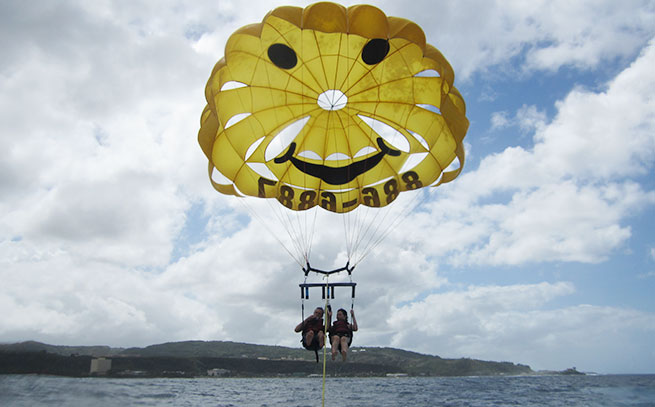 파라세일링: 하늘에서 드넓은 바다와 아름다운 괌의 전경을 감상할 수 있는 기회를 놓치고 싶지 않다면 파라세일링을 반드시 당신의 to-do 리스트에 넣어야 한다. 괌의 해안가를 체험하기 위해 당신이 필요한 것은 괌의 아름다운 해안가를 달리는 짧은 크루즈다. 괌의 많은 비치 클럽들은 당신에게 혼자서, 혹은 파트너와 함께 크루즈를 하면서 바다 위를 날아오를 수 있는 옵션을 제공한다.